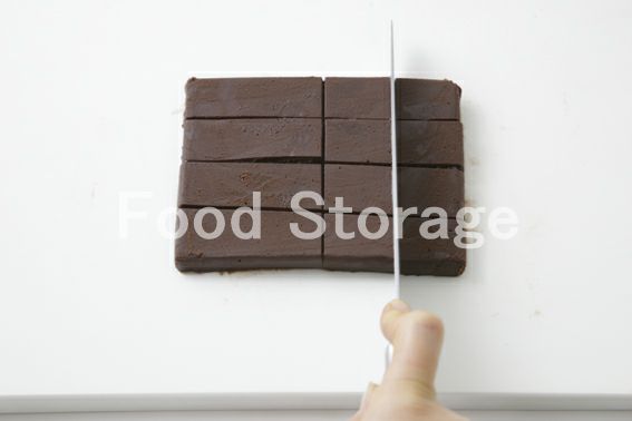 4が固まったら、型をはずしてオーブンシートをはがし、熱湯で温めて水けをふいたナイフか包丁で好みの大きさに切り分ける。 |
