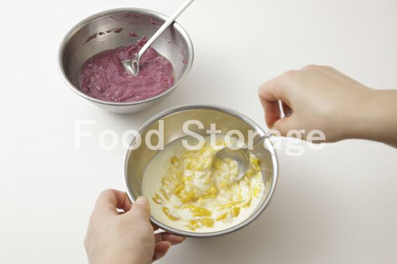フィリング用のホワイトチョコレートを湯せんにかけ、ゴムベラで混ぜながら溶かし、半量に分け、1のラズベリーとマンゴーをそれぞれに加え混ぜる。 |