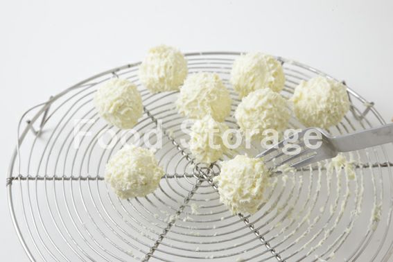 スプーン2本を使って丸めながらそれぞれ10個に取り分け、オーブンシートを敷いたバットにのせ、冷蔵庫で冷やし固めたら、手で丸めて整形する。 |