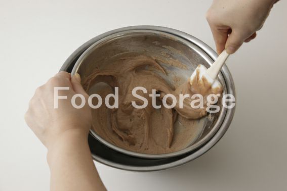 ボウルの底を氷水で冷やしてゆっくりと混ぜながらゴムベラで粘度が増し、スプーンで扱いやすい固さになるまで混ぜる。 |