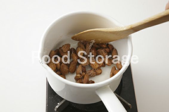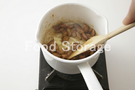 2の火を止めて、1のアーモンドを一気に加え、砂糖が固まってくるまで絶えず木べらで混ぜる。、 |