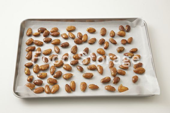 オーブンシートを敷いた天板にアーモンドを広げ、160℃に予熱したオーブンで5分ほどから焼きする。 |