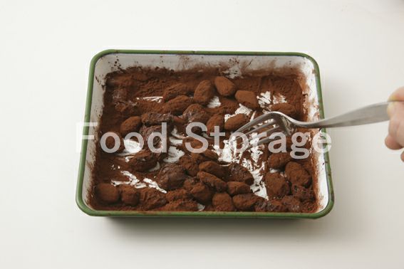 チョコが全部アーモンドに絡まったら、ココアパウダーをたっぷり入れたバットに1粒ずつ落としてはココアパウダーを全体にまぶす。 |