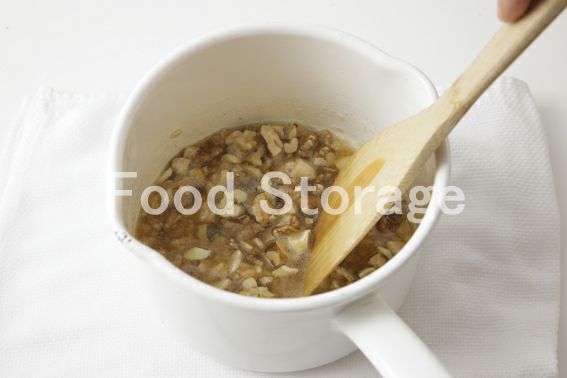 2にグラニュー糖、塩、カシューナッツ、くるみを加え、グラニュー糖が溶けるまでよく混ぜる。 |