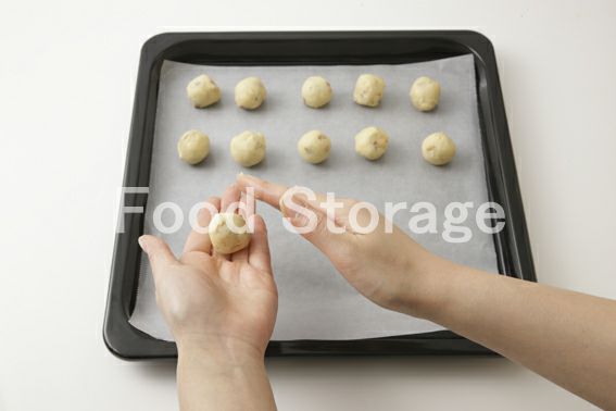 5の生地を冷蔵庫から出して、手のひらで一口大のボール状に丸め、整形する。 |