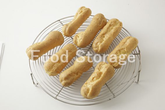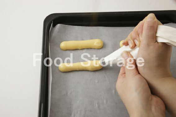 基本のシュー生地は、【シュークリーム】の作り方1〜5を参照して作る。直径1cmの丸口金をつけた絞り出し袋に入れ、天板に間隔をあけて10cm長さに絞る。 |
