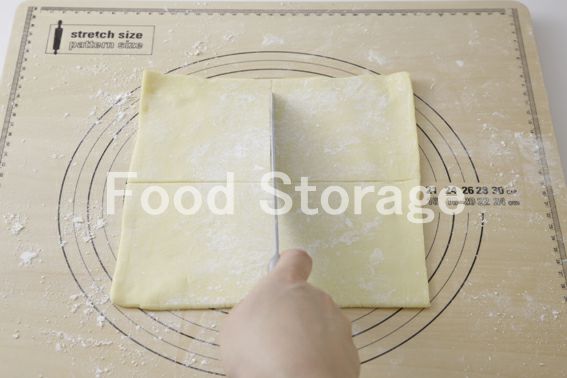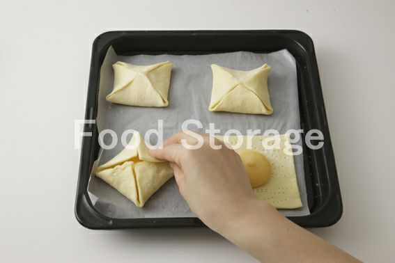 パイの四隅を中央に向かって合わせるように茶巾状に包む。しっかりと指で押さえて閉じる。 |