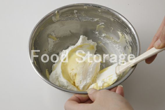 ボウルに生クリームを入れて、底を氷水で冷やしながら8分立てにし、別のボウルに入れたカスタードクリームに少しずつ加えて混ぜ合わせる。 |