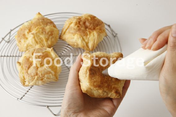 小さな丸口金をつけた絞り出し袋に8を入れ、7のパイシューの底に差し込んでクリームを詰める。茶こしで粉砂糖をふって仕上げる。 |