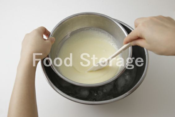 3をボウルに移し、氷水にあてて冷やしながらゴムべらでとろりとするまで混ぜる。 |