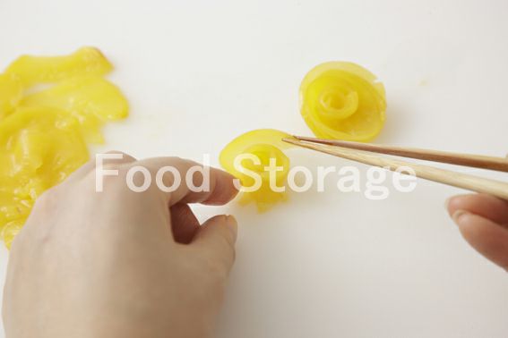 6を箸を使って、内側から上部を開き気味に巻きながらバラのような花形を4個作る。 |