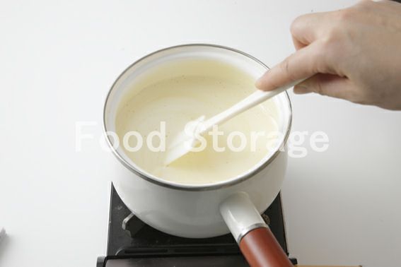 2を鍋に移し替えて弱火にかけ、バニラエッセンスを加えてゴムベラで混ぜる。湯気がうっすら出てきて、少しとろみがつくまでゆっくり加熱する。 |
