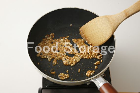 フライパンにAを弱火にかけてカラメル色になったら火を止め、アーモンドダイス、バターを加えて木ベラで混ぜ、オーブンシートに広げて冷ます。 |