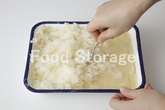 7 凍ったシャーベットが全体的に、水っぽさがなくなり、かき混ぜたシャーベットが細かくなったらOK。 |