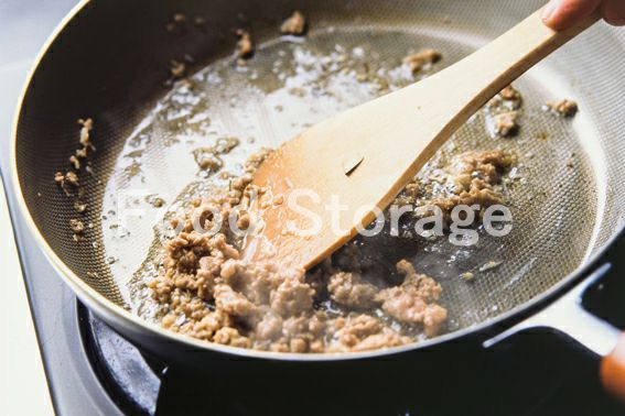 よく熱したフライパン(又は鍋)にサラダ油大さじ2を入れて熱し、Aを入れてよく炒めて香りを出し、豚ひき肉をほぐしながら炒める。ひき肉がパラパラになったら、豆板醤を加えて炒める。 |