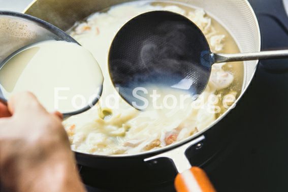 フライパン(又は鍋)にサラダ油、紹興酒、水、顆粒鶏がらスープの素を入れてひと煮立ちさせ、ほぐしたかに肉を加えてからAで味を調える。弱火にして水溶き片栗粉をゆっくり入れてとろみがついたら豆乳を加えて煮る。 |