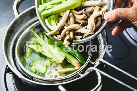 ・火の通りにくいれんこん、スナップえんどう、ブロッコリー、アスパラを先に入れてゆでる。後からチンゲン菜、しめじを加えてゆでると、かたさが均一になる。