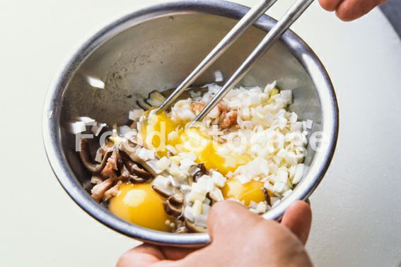 しいたけは石づきを切り落とし、チャーシューとともにマッチ棒程に切り揃えて大きめのボウルに入れる。そこへ卵を割り入れ、長ねぎのみじん切り、ほぐしたかに肉を加えAで下味をつけてかき混ぜる。 |