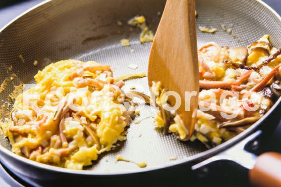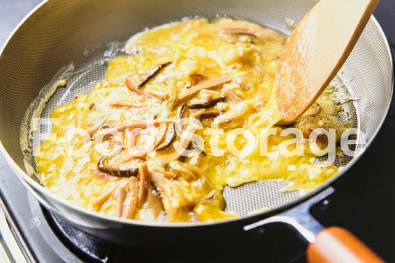 よく熱したフライパン(又は鍋)にサラダ油大さじ2を入れてよく熱し、油をなじませ、1の1/2量を流し入れる。 |