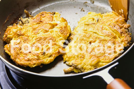 2を半熟状になるまで炒め、フライパン(又は鍋)をゆすりながら2つに分け、それぞれ両面をこんがりと焼き、器に盛る。1の残りも同様に焼く。 |