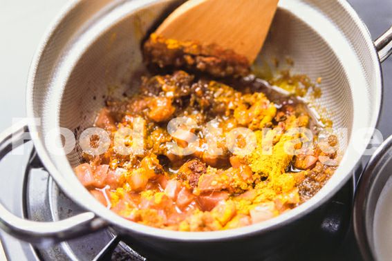 2にBを加えて炒め、香りが出たら手でつぶしたホールトマト缶、Cを加え30〜40分弱火で煮込む。ナンプラーで調味し、Dを加える。 |