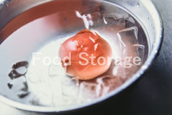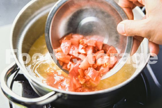 トマトは湯むきをする。へたを取り、反対側に十字に切り込みを入れ、さっとゆでて氷水に浸して皮をむいて種を取り除き、さいの目に切る。 |