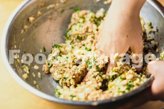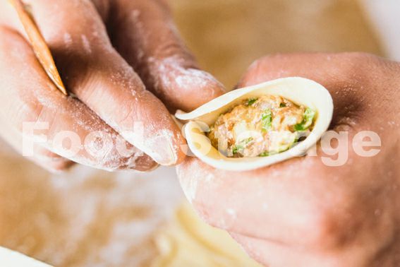 餃子の皮の真ん中に3の具を20g程度のせて、上をはさんでギャザーを作りながら包む。 |