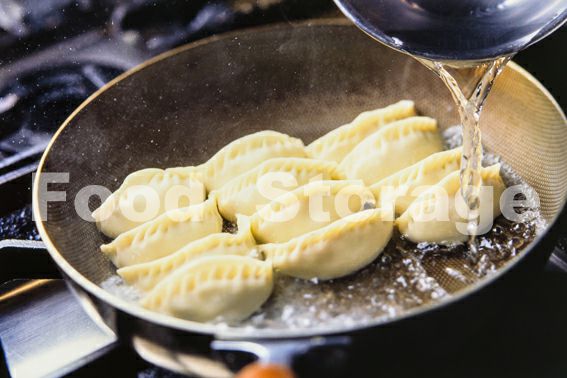 餃子のおしりに焼き色がついたら、湯3/4カップ(分量外)を加えてフタをして強火で蒸し焼きにする。 |