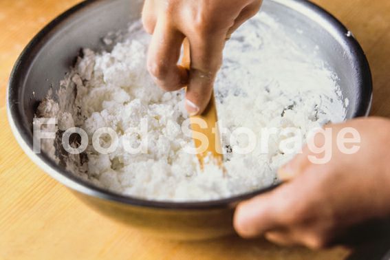 皮を作る。ボウルに浮き粉と片栗粉を入れ熱湯を注ぎ、木べらでそぼろ状になるまでよく混ぜる。 |