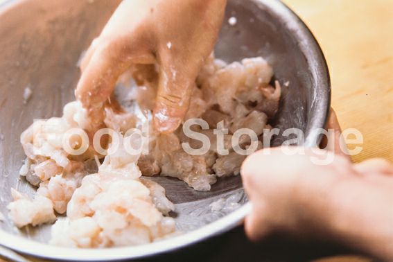 むきえびは背わたを取り、粗みじん切りにする。 |