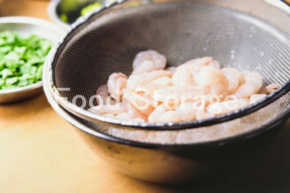 具を作る。えびは洗って、ペーパータオルなどでしっかり押さえて水気を拭き、3等分に切る。 |