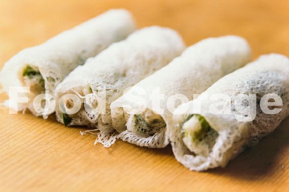 6のライスペーパーを手前に折り重ね、左から折りたたむ。 |