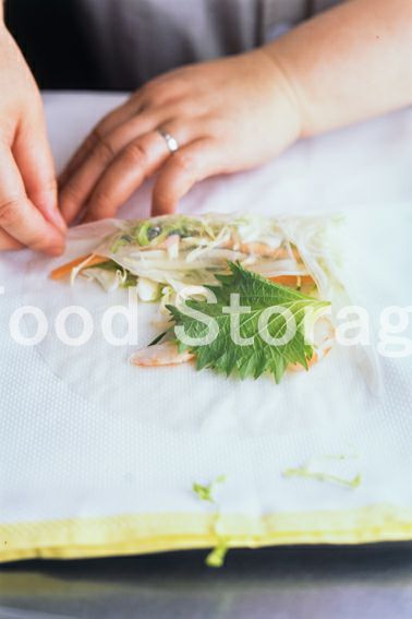 | 具をたくさん入れてぎゅうぎゅうに巻いて。具はえび以外にもゆでた鶏肉や豚肉、ハム、野菜もレタスやハーブ、春雨など。何でも巻いてください! |