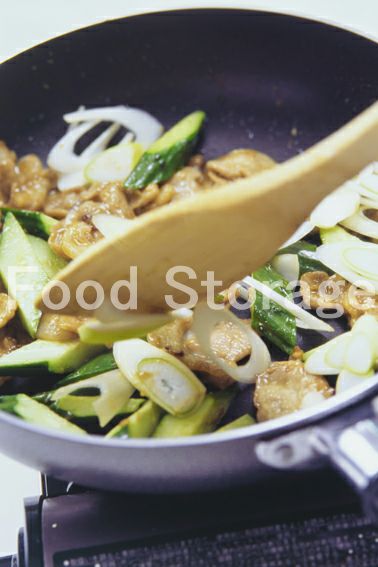 豚肉の色が変わったら、水けを拭いたきゅうり、長ねぎを加え炒める。 |