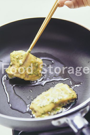 1に薄力粉をまぶし、2の衣をつけて、サラダ油を熱したフライパンで両面をこんがり焼いて火を通す。