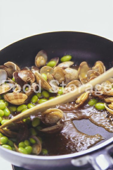 あさりの口が開いたら、2の枝豆を加えてさっと炒め合わせる。 |