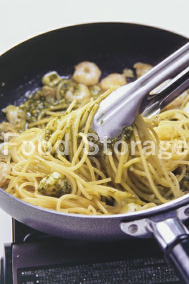 4 3にバジルペースト、ゆであがって水けをきったパスタ、パスタのゆで汁少々(分量外)を加えて絡め、塩で調味する。 |