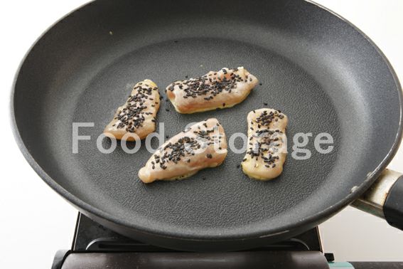 1.鶏ささみはすじを取り除き、ラップにはさんで、麺棒などでたたいて厚さを均等にし、半分に切る。,2.1に塩、こしょう、小麦粉を薄くまぶし、溶き卵をつけて黒ごまをふり、薄くサラダ油をひいたフライパンでこんがりと両面焼き、仕上げにしょうゆをかける。 |
