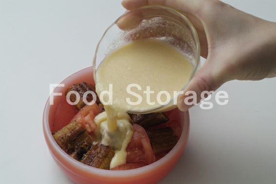 1を耐熱容器に並べ、混ぜ合わせたAを流し入れ、ピザ用チーズをのせて200〜230℃に温めたオーブンで10〜15分焼く。 |