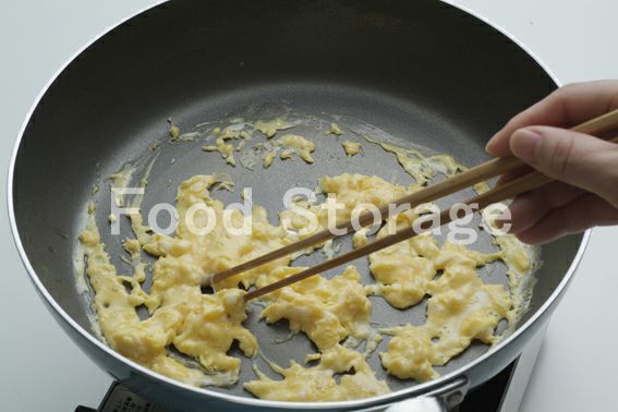 フライパンに半量のサラダ油を熱し、溶き卵を流し入れて混ぜ、半熟状態で取り出す。