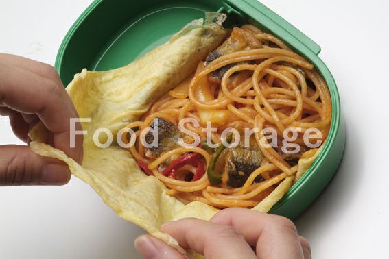2の薄焼き卵をお弁当箱に敷き、3を包み、クッキーの型抜きを使い、型をくり抜く。 |
