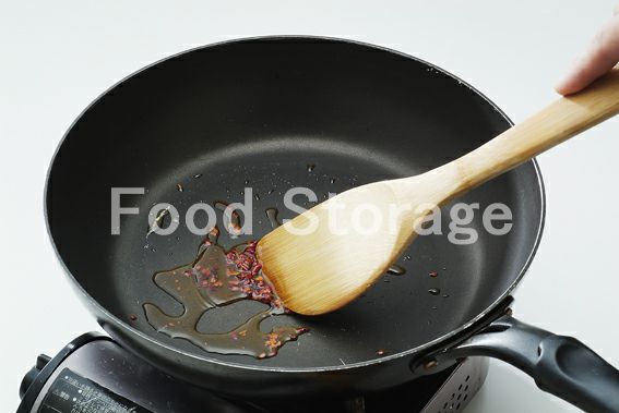 赤唐辛子は、ヘタと種を取ってハサミでみじん切りにして、残りのサラダ油とフライパンに入れ、弱火でじっくり炒める。2をもどして炒め合わせ、酢、塩、こしょうで味を調える。 |