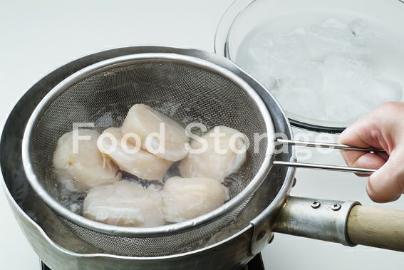 ほたては柄付きのざるに入れ、熱湯につけてさっとゆがき(表面の色が変わればよい)、氷水にとり、水けをふいて横半分に切る。