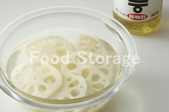 れんこんは皮をむき、3cmくらいを薄いいちょう切り、残りは酢水につけておく。 |