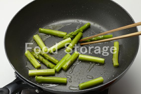アスパラガスは固い根元を切り落とし、下から7〜8cmくらいまで皮をむいて4等分に切る。 |