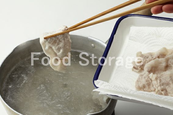 鍋にたっぷりの湯を沸かして酒を加え、豚肉をゆがいて、ペーパータオルの上にとる。
