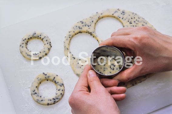 小麦粉(分量外)を敷いたまな板の上に、4の生地を広げ、麺棒で5〜7mm厚さに伸ばし、大きさの違う2種類の丸い型で抜く。 |