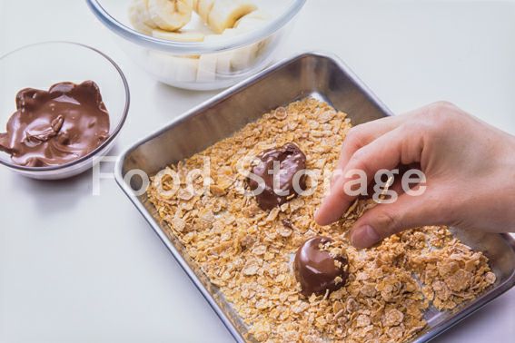 耐熱容器にチョコレートを入れ、電子レンジ(600W)で2分加熱する。1のバナナを入れてからめ、2をまぶし、冷凍庫に入れて冷やしかためる。
