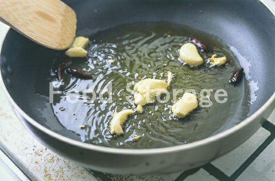 鍋にオリーブ油と1のにんにくを入れて弱火にかける。途中、1の赤唐辛子も加える。 |