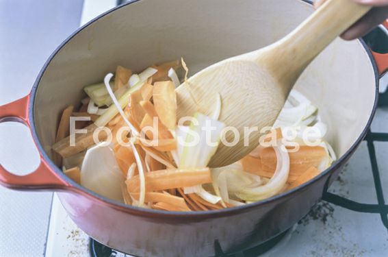 玉ねぎ、にんじん、にんにく、セロリは薄切りにする。 |